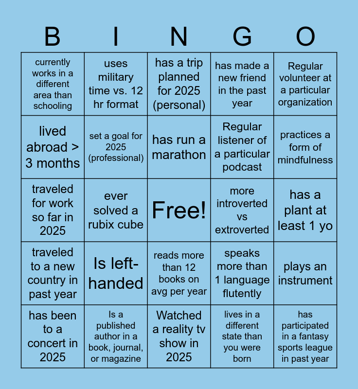 This bingo card has a free space and 24 words: Is left-handed, Is a published author in a book, journal, or magazine, has run a marathon, has been to a concert in 2025, Regular volunteer at a particular organization, currently works in a different area than schooling, lived abroad > 3 months, uses military time vs. 12 hr format, more introverted vs extroverted, reads more than 12 books on avg per year, Regular listener of a particular podcast, traveled for work so far in 2025, speaks more than 1 language flutently, plays an instrument, set a goal for 2025 (professional), lives in a different state than you were born, has a plant at least 1 yo, has a trip planned for 2025 (personal), practices a form of mindfulness, ever solved a rubix cube, has participated in a fantasy sports league in past year, traveled to a new country in past year, has made a new friend in the past year and Watched a reality tv show in 2025.