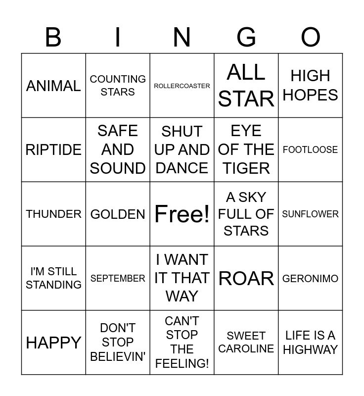 This bingo card has a free space and 25 words: SEPTEMBER, CAN'T STOP THE FEELING!, SHUT UP AND DANCE, HAPPY, HIGH HOPES, ANIMAL, RIPTIDE, COUNTING STARS, A SKY FULL OF STARS, I WANT IT THAT WAY, EYE OF THE TIGER, THUNDER, ROAR, GERONIMO, SAFE AND SOUND, SUMMER, SUNFLOWER, ROLLERCOASTER, FOOTLOOSE, GOLDEN, LIFE IS A HIGHWAY, DON'T STOP BELIEVIN', I'M STILL STANDING, ALL STAR and SWEET CAROLINE.