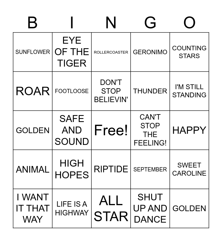 This bingo card has a free space and 31 words: ALL STAR, SWEET CAROLINE, SAFE AND SOUND, SUMMER, SUNFLOWER, ROLLERCOASTER, FOOTLOOSE, SEPTEMBER, CAN'T STOP THE FEELING!, SHUT UP AND DANCE, HAPPY, GOLDEN, LIFE IS A HIGHWAY, DON'T STOP BELIEVIN', I'M STILL STANDING, ALL STAR, SWEET CAROLINE, HIGH HOPES, ANIMAL, RIPTIDE, COUNTING STARS, A SKY FULL OF STARS, I WANT IT THAT WAY, EYE OF THE TIGER, THUNDER, ROAR, GERONIMO, GOLDEN, LIFE IS A HIGHWAY, DON'T STOP BELIEVIN' and I'M STILL STANDING.