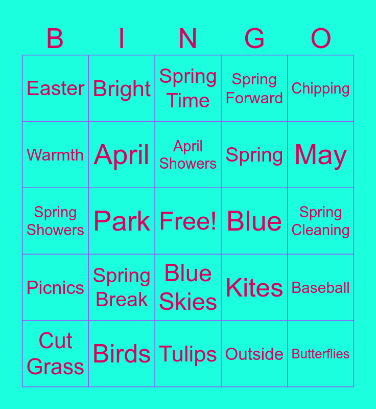 This bingo card has a free space and 34 words: Bunnies, Garden, Bloom, Fresh, Spring Cleaning, Warmth, April, Tulips, Spring, Butterflies, Spring Showers, Bright, Outside, Breezy, Picnics, Park, Blue Skies, Blue, Baseball, Cut Grass, Birds, Bugs, Spring Forward, May, Flowers, Spring Break, Spring Time, Petals, Chipping, Easter, Trees, April Showers, Kites and Rainbow.