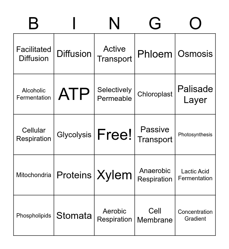This bingo card has a free space and 24 words: Phospholipids, Proteins, Selectively Permeable, Cell Membrane, Osmosis, Facilitated Diffusion, Diffusion, Active Transport, Passive Transport, Photosynthesis, Cellular Respiration, ATP, Anaerobic Respiration, Lactic Acid Fermentation, Alcoholic Fermentation, Stomata, Aerobic Respiration, Phloem, Palisade Layer, Mitochondria, Glycolysis, Xylem, Chloroplast and Concentration Gradient.
