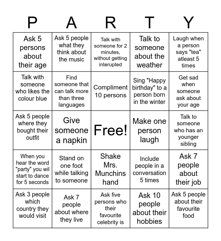 This bingo card has a free space and 24 words: Stand on one foot while talking to someone, Ask 7 people about where they live, Compliment 10 persons, Ask 3 people which country they would visit, Laugh when a person says "tea" atleast 5 times, Ask 5 persons about their age, Talk with someone who likes the colour blue, Ask 5 people what they think about the music, Make one person laugh, Shake Mrs. Munchins hand, Sing "Happy birthday" to a person born in the winter, Ask 5 people where they bought their outfit, Include people in a conversation 5 times, Ask 7 people about their job, Find someone that can talk more than three languages, Ask 10 people about their hobbies, Talk to someone who has an younger sibling, Talk with someone for 2 minutes, without getting interupted, Get sad when someone ask about your age, Give someone a napkin, Ask 5 people about their favourite food, When you hear the word "party" you wil start to dance for 5 seconds, Talk to someone about the weather and Ask five persons who their favourite celebrity is.