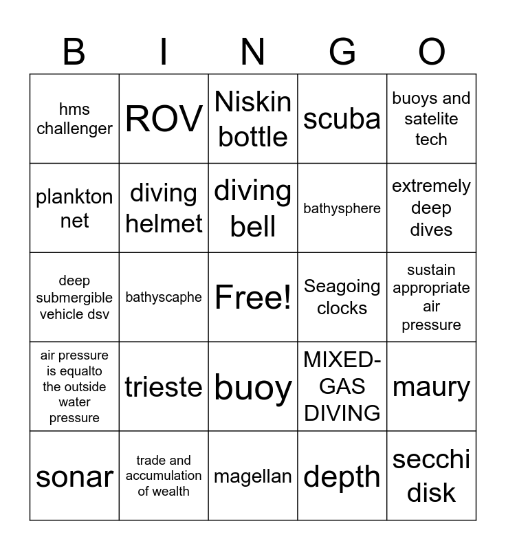 This bingo card has a free space and 24 words: trieste, trade and accumulation of wealth, diving bell, sonar, buoys and satelite tech, hms challenger, plankton net, ROV, Seagoing clocks, buoy, bathysphere, deep submergible vehicle dsv, MIXED-GAS DIVING, maury, diving helmet, depth, sustain appropriate air pressure, Niskin bottle, extremely deep dives, bathyscaphe, secchi disk, air pressure is equalto the outside water pressure, scuba and magellan.