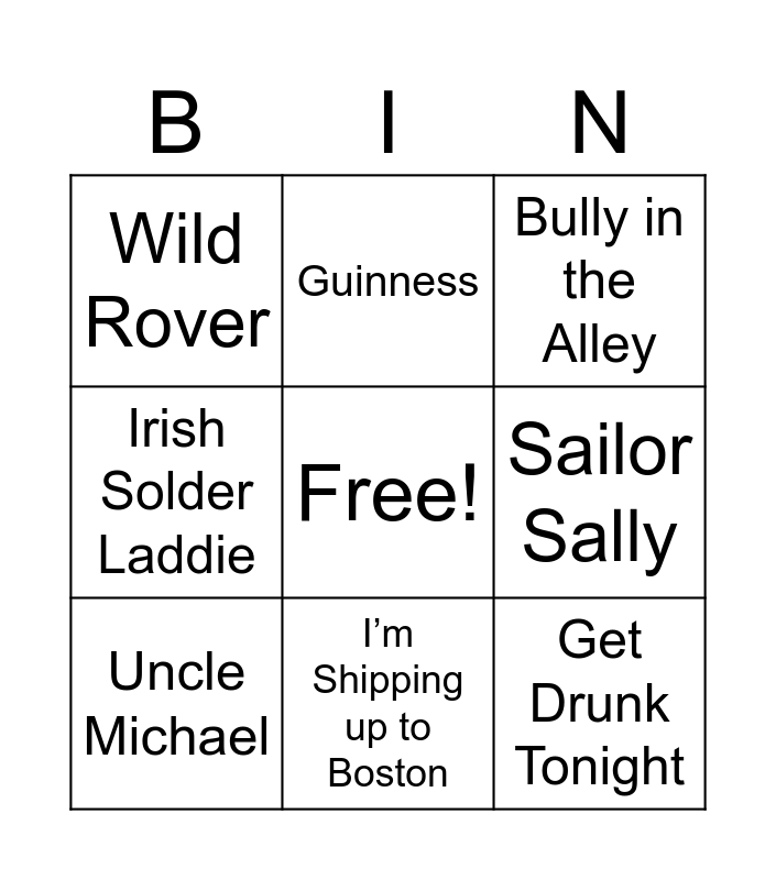 This bingo card has a free space and 15 words: An Irish Pub Song, Drink up ya Sinners, Bully in the Alley, Wild Rover, I’m Shipping up to Boston, Get Drunk Tonight, Loud ‘n’ Proud ‘n’ Bold, Irish Rover, Sailor Sally, Drunken Lullabies, The Saints Are up, Irish Solder Laddie, Uncle Michael, Guinness and Captain Kelly’s kitchen.