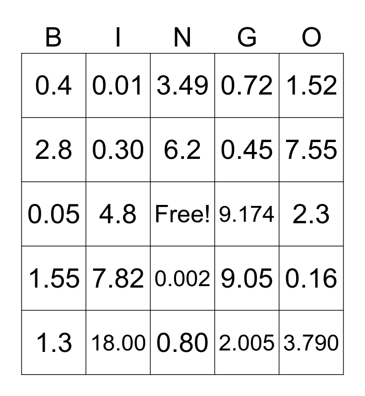 This bingo card has a free space and 24 words: 1.3, 7.82, 6.2, 2.005, 1.52, 0.4, 0.01, 3.49, 9.174, 2.3, 0.05, 0.30, 9.05, 0.16, 2.8, 18.00, 0.80, 0.72, 7.55, 1.55, 4.8, 0.002, 0.45 and 3.790.