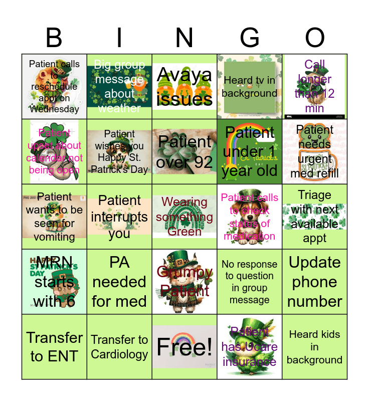 This bingo card has 19 images and 25 words: MRN starts with 6, Transfer to Cardiology, Wearing something Green, Patient has Ucare insurance, Call longer than 12 min, Patient calls to reschedule appt on Wednesday, Big group message about weather, Avaya issues, Patient calls to check status of medication, Update phone number, Patient upset about calendar not being open, Patient wishes you Happy St. Patrick's Day, Free!, No response to question in group message, Patient needs urgent med refill, Transfer to ENT, Patient interrupts you, Patient over 92, Patient under 1 year old, Triage with next available appt, Patient wants to be seen for vomiting, PA needed for med, Grumpy Patient, Heard tv in background and Heard kids in background.