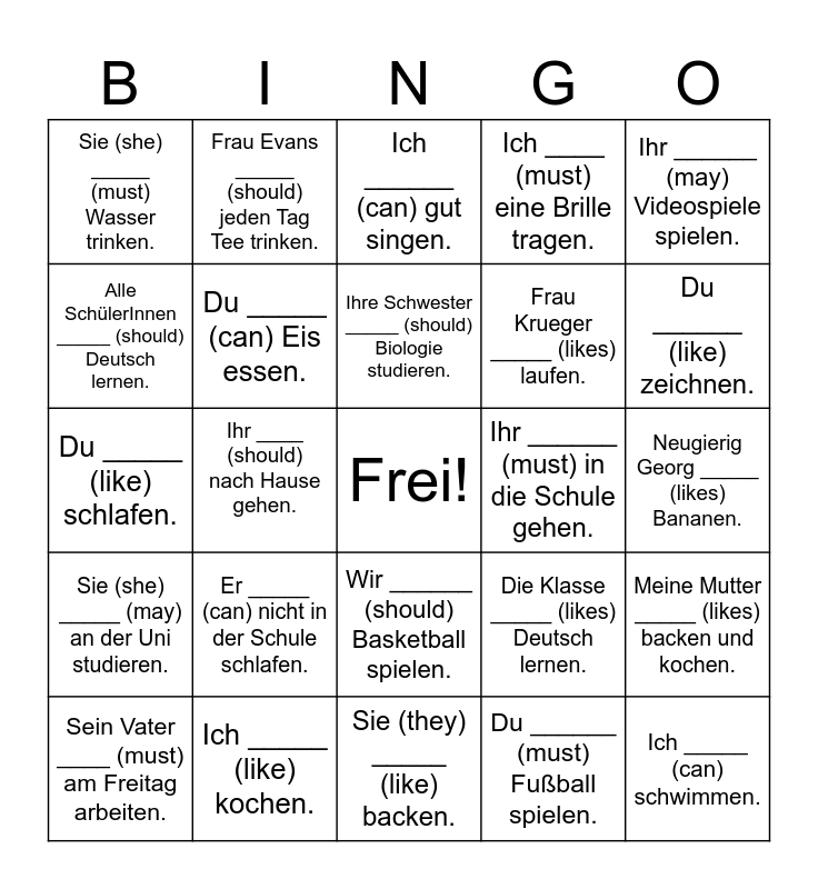 This bingo card has a free space and 30 words: Ich _____ (like) kochen., Du ____ (can) tanzen., Ihr ____ (should) nach Hause gehen., Er ____ (should) Hausaufgabe machen., Sie (she) _____ (must) Wasser trinken., Ich ______ (can) gut singen., Du _____ (can) Eis essen., Wir ______ (should) Basketball spielen., Ihr ______ (must) in die Schule gehen., Sie (they) _____ (like) backen., Neugierig Georg _____ (likes) Bananen., Ich _____ (can) schwimmen., Du ______ (must) Fußball spielen., Ihr _____ (should) essen., Du ______ (like) zeichnen., Wir ______ (can) schreiben., Die Klasse _____ (likes) Deutsch lernen., Sie (she) _____ (may) an der Uni studieren., Er _____ (can) nicht in der Schule schlafen., Ihr ______ (may) Videospiele spielen., Du _____ (like) schlafen., Ich _____ (like) mit meinen Freunden treffen., Frau Evans _____ (should) jeden Tag Tee trinken., Frau Krueger _____ (likes) laufen., Alle SchülerInnen _____ (should) Deutsch lernen., Ich ____ (must) eine Brille tragen., Meine Mutter _____ (likes) backen und kochen., Sein Vater ____ (must) am Freitag arbeiten., Ihre Schwester _____ (should) Biologie studieren. and Unser Bruder _____ (likes) Erdkunde lernen..