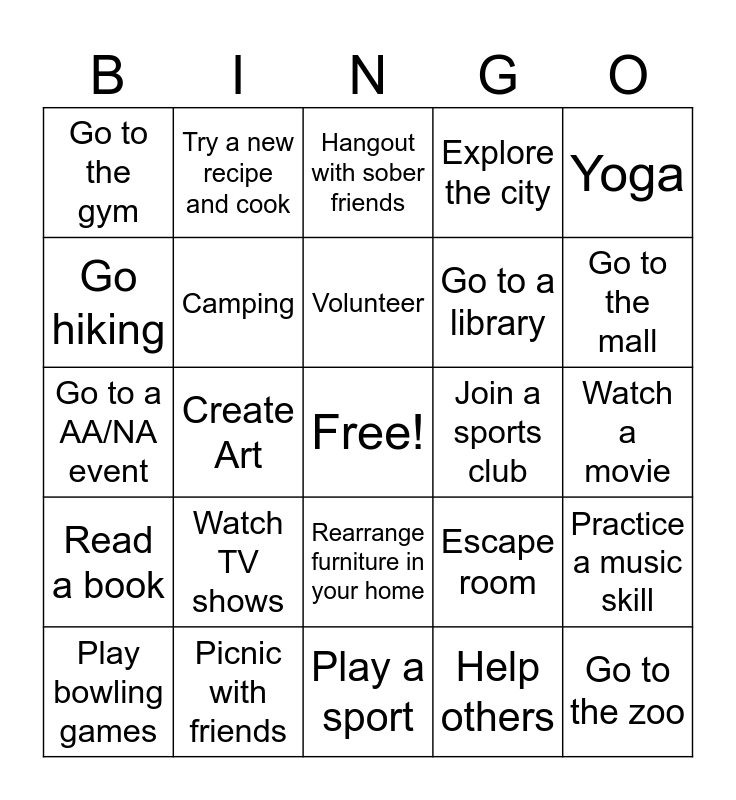 This bingo card has a free space and 24 words: Watch TV shows, Picnic with friends, Volunteer, Play bowling games, Yoga, Go to the gym, Go hiking, Try a new recipe and cook, Join a sports club, Rearrange furniture in your home, Go to a library, Go to a AA/NA event, Escape room, Practice a music skill, Camping, Help others, Watch a movie, Hangout with sober friends, Go to the mall, Create Art, Go to the zoo, Read a book, Explore the city and Play a sport.