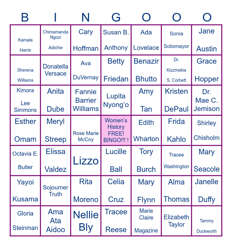 This bingo card has a free space and 48 words: Mary Flynn, Dr. Kizzmekia S. Corbett, Tracee Reese, Meryl Streep, Fannie Barrier Williams, Shirley Chisholm, Chimamanda Ngozi Adichie, Ama Ata Aidoo, Sonia Sotomayor, Lucille Ball, Jane Austin, Susan B. Anthony, Kristen DePaul, Amy Tan, Yayoi Kusama, Frida Kahlo, Sherena Williams, Grace Hopper, Alma Thomas, Ada Lovelace, Benazir Bhutto, Rose Marie McCoy, Kamala Harris, Donatella Versace, Janelle Duffy, Ava DuVernay, Dr. Mae C. Jemison, Gloria Steinman, Lupita Nyong’o, Anita Dube, Elizabeth Taylor, Edith Wharton, Mary Seacole, Sojourner Truth, Esther Omam, Tory Burch, Tracee Washington, Kimora Lee Simmons, Lizzo, Rita Moreno, Octavia E. Butler, Tammy Duckworth, Cary Hoffman, Nellie Bly, Betty Friedan, Celia Cruz, Elissa Valdez and Marie Claire Magazine.