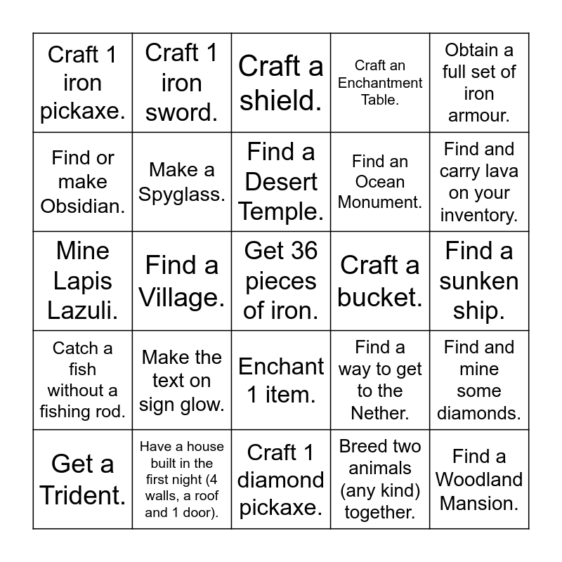 This bingo card has 25 words: Catch a fish without a fishing rod., Have a house built in the first night (4 walls, a roof and 1 door)., Get 36 pieces of iron., Breed two animals (any kind) together., Obtain a full set of iron armour., Craft 1 iron pickaxe., Craft 1 iron sword., Craft a shield., Craft a bucket., Find and mine some diamonds., Find or make Obsidian., Make a Spyglass., Craft 1 diamond pickaxe., Find a way to get to the Nether., Find and carry lava on your inventory., Get a Trident., Find a Village., Find a Desert Temple., Find an Ocean Monument., Find a sunken ship., Mine Lapis Lazuli., Make the text on sign glow., Enchant 1 item., Craft an Enchantment Table. and Find a Woodland Mansion..