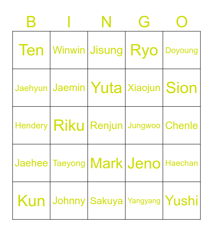 This bingo card has a free space and 24 words: Taeyong, Johnny, Yuta, Kun, Doyoung, Ten, Jaehyun, Winwin, Jungwoo, Mark, Xiaojun, Hendery, Jeno, Haechan, Jaemin, Yangyang, Chenle, Jisung, Sion, Riku, Yushi, Jaehee, Ryo and Sakuya.
