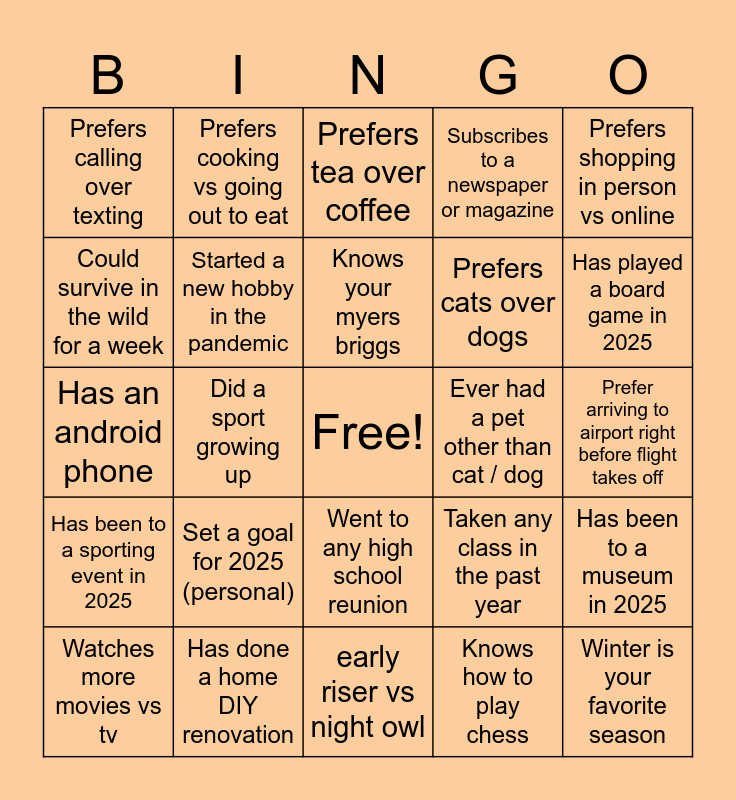 This bingo card has a free space and 24 words: Set a goal for 2025 (personal), Has done a home DIY renovation, Knows your myers briggs, Watches more movies vs tv, Prefers shopping in person vs online, Prefers calling over texting, Could survive in the wild for a week, Prefers cooking vs going out to eat, Ever had a pet other than cat / dog, Went to any high school reunion, Prefers cats over dogs, Has an android phone, Taken any class in the past year, Has been to a museum in 2025, Started a new hobby in the pandemic, Knows how to play chess, Prefer arriving to airport right before flight takes off, Prefers tea over coffee, Has played a board game in 2025, Did a sport growing up, Winter is your favorite season, Has been to a sporting event in 2025, Subscribes to a newspaper or magazine and early riser vs night owl.