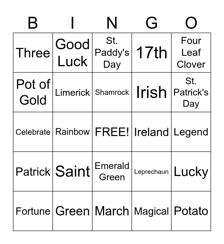 This bingo card has a free space and 24 words: Saint, Green, Shamrock, Fortune, Four Leaf Clover, Three, Pot of Gold, Good Luck, Ireland, Emerald Green, Irish, Celebrate, Leprechaun, Lucky, Limerick, Magical, Legend, St. Paddy's Day, St. Patrick's Day, Rainbow, Potato, Patrick, 17th and March.