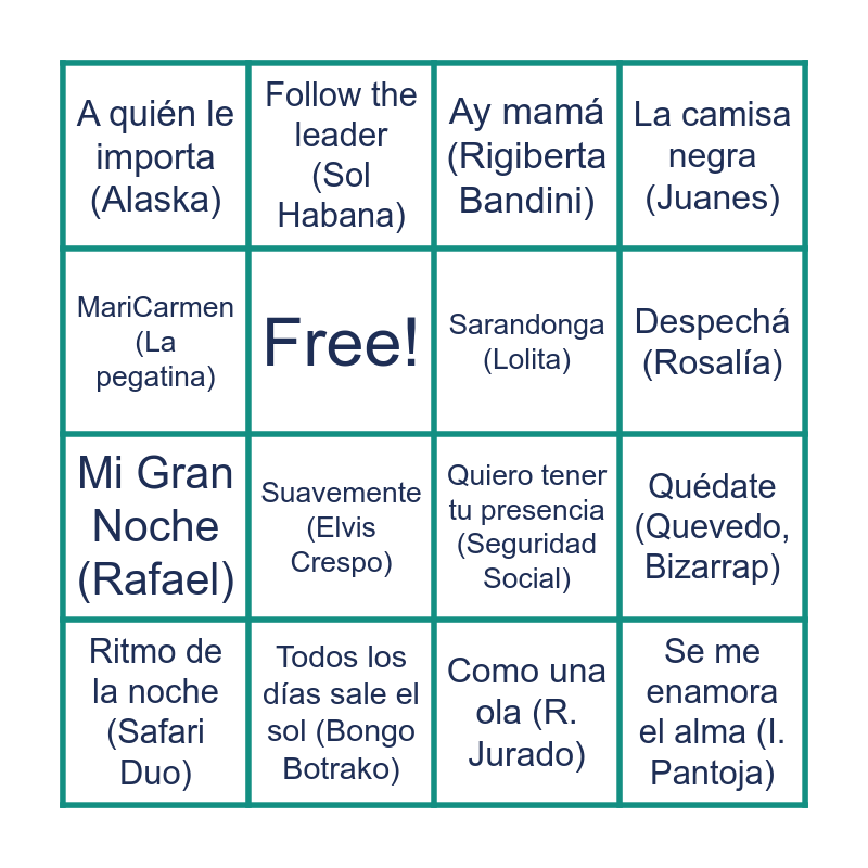 This bingo card has 51 words: Que te den (Amparanoia), Ritmo de la noche (Safari Duo), Cuando zarpa el amor (Camela), Por la raja de tu falda (Estopa), Gasolina (Daddy Yankee), Livin´la vida loca (Ricky Martin), Follow the leader (Sol Habana), Ólvidame y pega la vuelta (Pimpinela), Free!, La Gozadera (Marc Anthony), Sarandonga (Lolita), La camisa negra (Juanes), Viva la vida (Coldplay), Whenever, wherever (Shakira), You're the one that I want (J.Travolta y O. Newton), Dancing Queen (Abba), Despechá (Rosalía), Todos los días sale el sol (Bongo Botrako), La revolución sexual (La casa azul), MariCarmen (La pegatina), Quédate (Quevedo, Bizarrap), Hay que venir al sur (Rafaela Carra), A quién le importa (Alaska), Mi Gran Noche (Rafael), La Bomba (King Africa), Vivir mi vida (Marc Anthony), Suavemente (Elvis Crespo), Amigos para siempre (Los Manolos), Salta (Tequila), Ay mamá (Rigiberta Bandini), I will Survive (Aretha Franklin), La chica yeyé (Ole Ole), Formentera (Aitana), Volaré (Gipsy Kings), Bamboleo (Gipsy Kings), La bicicleta (C.Vives y Shakira), La mordidita (Ricky Martin), Desatame (M. Naranjo), Mi carro (M. Escobar), El muerto vivo (Peret), Como una ola (R. Jurado), Se me enamora el alma (I. Pantoja), Amante bandido (Miguel Bosé), Devuélveme a mi chica (Hombres G), Escándalo (Rafael), Mala Vida (Mano Negro), Quiero tener tu presencia (Seguridad Social), Mi Tierra (Gloria Estefan), Pantalones (O.Montes, L.Indigo etc), Sobreviviré (M. Naranjo) and Nochentera (Vicco).
