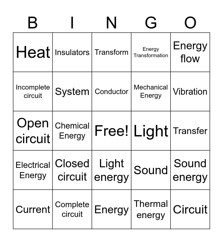 This bingo card has a free space and 24 words: Closed circuit, Complete circuit, Conductor, Current, Energy flow, Heat, Incomplete circuit, Insulators, Light, Light energy, Mechanical Energy, Open circuit, Sound, Sound energy, System, Thermal energy, Transfer, Transform, Vibration, Chemical Energy, Circuit, Electrical Energy, Energy Transformation and Energy.