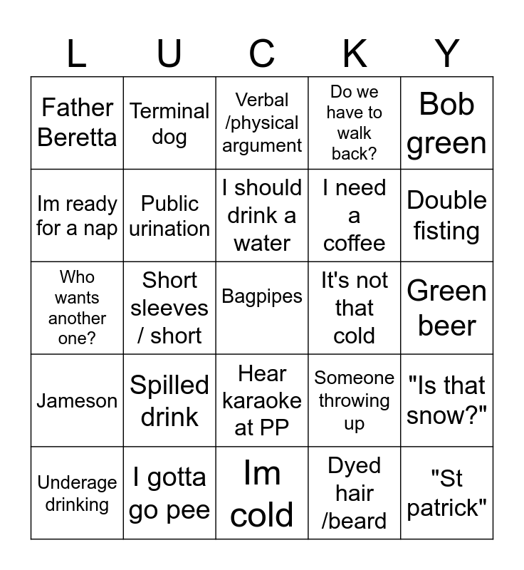 This bingo card has a free space and 31 words: Im cold, Someone not wearing green, Short sleeves / short, Kilt /tutu, Father Beretta, Verbal /physical argument, Public urination, Someone throwing up, It's not that cold, Dyed hair /beard, Green beer, "St patrick", Zyns, Woo girls, Double fisting, Fireball shots, "Is that snow?", Spilled drink, Jameson, Hear karaoke at PP, Bob green, Police putting someone in handcuffs, Underage drinking, Terminal dog, I need a coffee, Im ready for a nap, Do we have to walk back?, Who wants another one?, I gotta go pee, I should drink a water and I want something to eat.