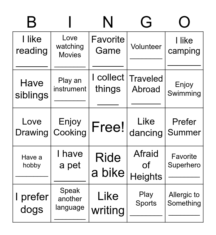 This bingo card has a free space and 24 words: I have a pet ______, Speak another language ________, I collect things ____, I prefer dogs, I like camping _______, I like reading ______, Have siblings, Love watching Movies ________, Like dancing, Ride a bike, Traveled Abroad ______, Love Drawing, Afraid of Heights, Favorite Superhero ________, Play an instrument ________, Play Sports ________, Prefer Summer, Favorite Game ______, Enjoy Swimming, Enjoy Cooking, Allergic to Something ________, Have a hobby _________, Volunteer ________ and Like writing.