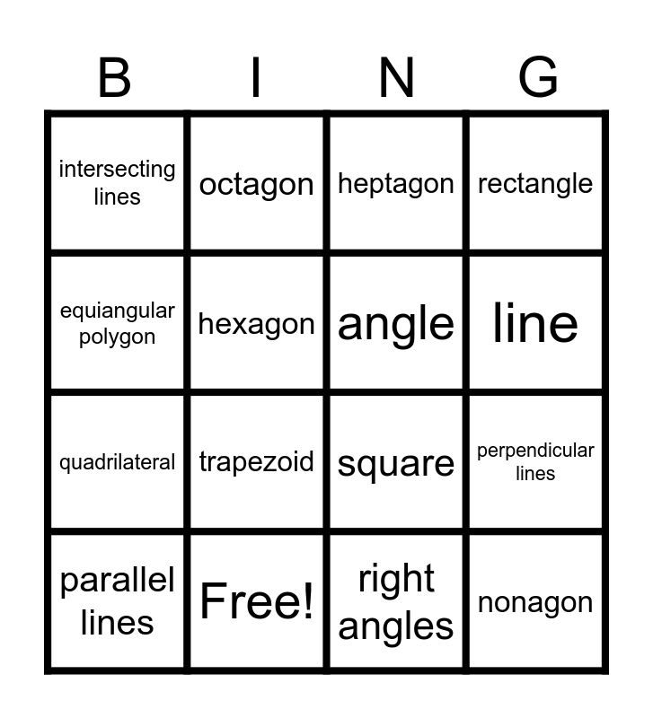 This bingo card has 28 words: polygon, line segment, quadrilateral, pentagon, hexagon, heptagon, octagon, nonagon, Free!, decagon, square, rectangle, parallelogram, rhombus, trapezoid, triangle, ray, angle, line, point, intersecting lines, vertex, parallel lines, perpendicular lines, right angles, equilateral polygon, equiangular polygon and regular polygon.