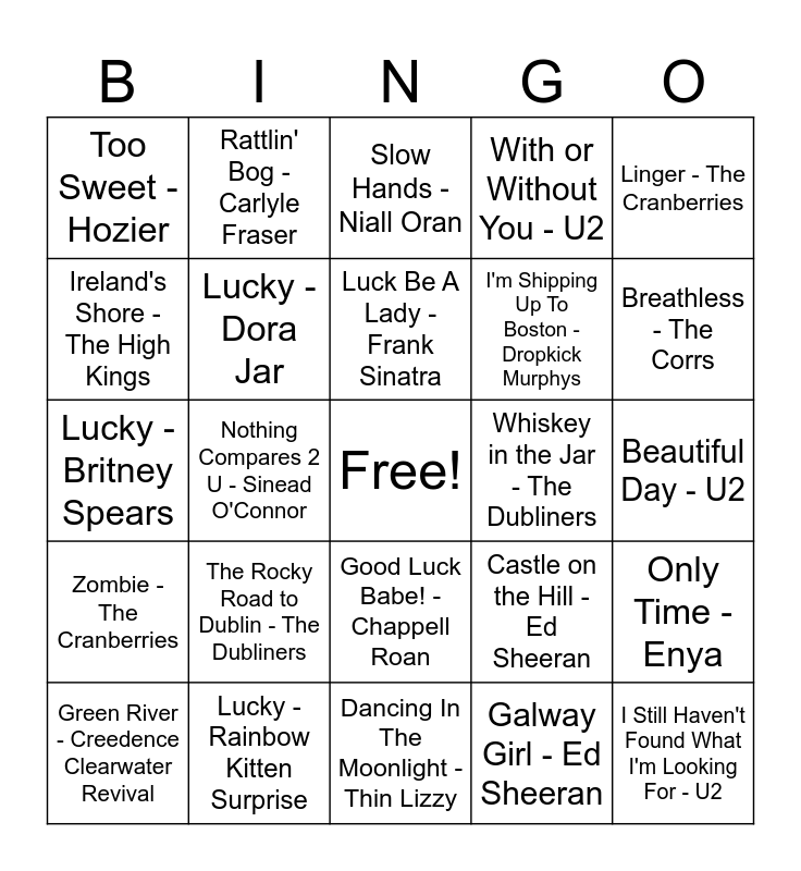 This bingo card has a free space and 41 words: Lucky - Jason Mraz, Lucky - Britney Spears, Lucky - Halsey, Lucky - Dora Jar, Lucky - Rainbow Kitten Surprise, Good Luck Babe! - Chappell Roan, Luck Be A Lady - Frank Sinatra, Dreams - The Cranberries, Linger - The Cranberries, Zombie - The Cranberries, Nothing Compares 2 U - Sinead O'Connor, With or Without You - U2, I Still Haven't Found What I'm Looking For - U2, Beautiful Day - U2, Whiskey in the Jar - The Dubliners, The Rocky Road to Dublin - The Dubliners, Take Me to Church - Hozier, Too Sweet - Hozier, Brown Eyed Girl - Van Morrison, Slow Hands - Niall Oran, Only Time - Enya, The Boys Are Back In Town - Thin Lizzy, Dancing In The Moonlight - Thin Lizzy, I'm Shipping Up To Boston - Dropkick Murphys, C'est la Vie - B*Witched, Drunken Sailor - The Irish Rovers, Galway Girl - Ed Sheeran, Runaway - The Corrs, Breathless - The Corrs, Breakeven - The Script, Drunken Lullabies - Flogging Molly, Rattlin' Bog - Carlyle Fraser, Green River - Creedence Clearwater Revival, Kelly, The Wearing of the Green - Brian Boru Irish Pipe Band, Castle on the Hill - Ed Sheeran, Ireland's Shore - The High Kings, St. Patrick's Day - Freccero, St. Patrick's Day - John Mayer, Arrive On St. Patrick's Day - Sir Reg, St. Patrick's Day Parade - Bing Crosby and Danny Boy - The Irish Tenors.