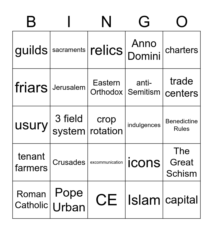 This bingo card has a free space and 24 words: Crusades, Pope Urban, Eastern Orthodox, Roman Catholic, charters, guilds, friars, sacraments, indulgences, excommunication, anti-Semitism, usury, icons, The Great Schism, Jerusalem, Islam, Benedictine Rules, relics, trade centers, 3 field system, capital, tenant farmers, Anno Domini and CE.