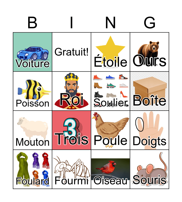 This bingo card has 19 images and 20 words: Doigts, Bouche, Étoile, Poire, Foulard, Poisson, Fourmi, Voiture, Mouton, Gratuit!, Trois, Poule, Roi, Souris, Soulier, Noix de coco, Boîte, Ours, Oiseau and Fourchette.