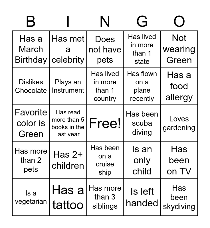 This bingo card has a free space and 24 words: Has 2+ children, Has a tattoo, Has lived in more than 1 country, Is a vegetarian, Not wearing Green, Has a March Birthday, Dislikes Chocolate, Has met a celebrity, Has been scuba diving, Has been on a cruise ship, Has flown on a plane recently, Favorite color is Green, Is an only child, Has been on TV, Plays an Instrument, Is left handed, Loves gardening, Does not have pets, Has a food allergy, Has read more than 5 books in the last year, Has been skydiving, Has more than 2 pets, Has lived in more than 1 state and Has more than 3 siblings.