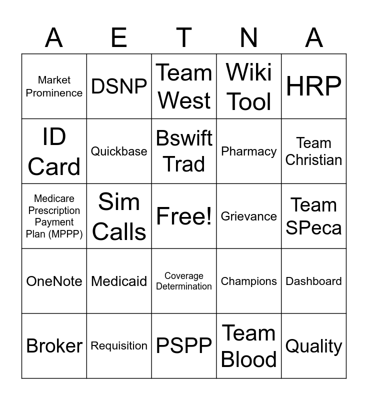 This bingo card has a free space and 24 words: Medicaid, Requisition, Bswift Trad, Broker, HRP, Market Prominence, ID Card, DSNP, Grievance, Coverage Determination, Pharmacy, Medicare Prescription Payment Plan (MPPP), Champions, Dashboard, Quickbase, Team Blood, Team SPeca, Team West, Team Christian, Sim Calls, Quality, OneNote, Wiki Tool and PSPP.