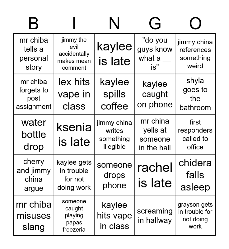 This bingo card has a free space and 27 words: rachel is late, cara and jimmy china argue, kaylee caught on phone, kaylee hits vape in class, mr chiba forgets to post assignment, kaylee is late, jimmy the evil accidentally makes mean comment, cherry and jimmy china argue, mr china yells at someone in the hall, chidera falls asleep, water bottle drop, "do you guys know what a __ is", mr chiba misuses slang, someone caught playing papas freezeria, shyla goes to the bathroom, kaylee forgot pencil, lex hits vape in class, kaylee spills coffee, kaylee gets in trouble for not doing work, mr chiba tells a personal story, first responders called to office, screaming in hallway, ksenia is late, grayson gets in trouble for not doing work, someone drops phone, jimmy china references something weird and mr chiba plays music.