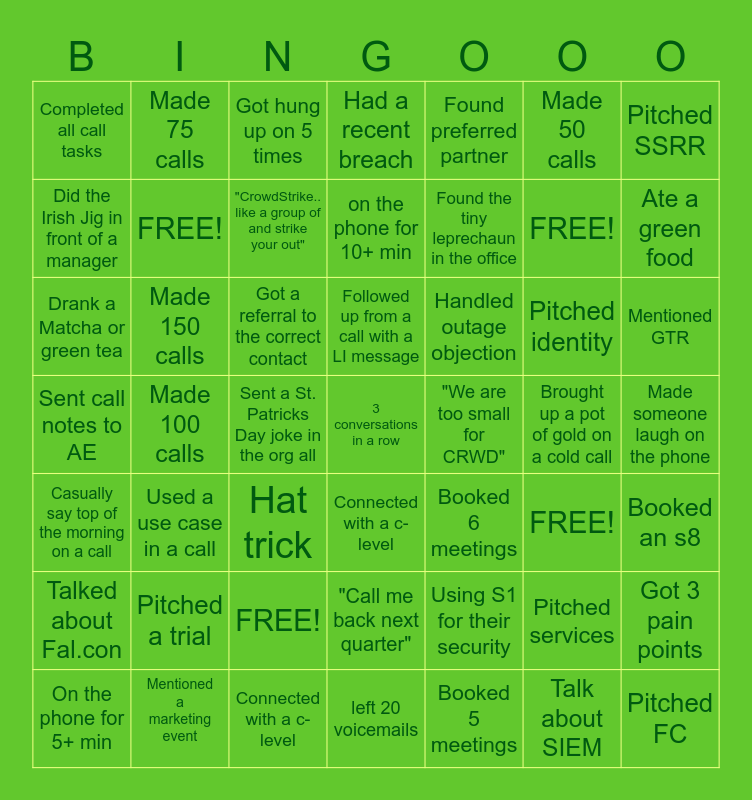 This bingo card has 49 words: Pitched services, FREE!, Booked 5 meetings, Made 100 calls, Got a referral to the correct contact, Made someone laugh on the phone, Made 75 calls, Connected with a c-level, Made 50 calls, Connected with a c-level, Pitched SSRR, Had a recent breach, Pitched identity, Handled outage objection, Pitched a trial, Brought up a pot of gold on a cold call, Did the Irish Jig in front of a manager, Ate a green food, Got 3 pain points, Found preferred partner, Found the tiny leprechaun in the office, Sent a St. Patricks Day joke in the org all, Completed all call tasks, FREE!, On the phone for 5+ min, "CrowdStrike.. like a group of and strike your out", Mentioned GTR, Mentioned a marketing event, Followed up from a call with a LI message, Made 150 calls, Pitched FC, "We are too small for CRWD", Talked about Fal.con, FREE!, Sent call notes to AE, Booked 6 meetings, FREE!, Booked an s8, Drank a Matcha or green tea, Hat trick, "Call me back next quarter", Casually say top of the morning on a call, 3 conversations in a row, left 20 voicemails, on the phone for 10+ min, Got hung up on 5 times, Using S1 for their security, Used a use case in a call and Talk about SIEM.