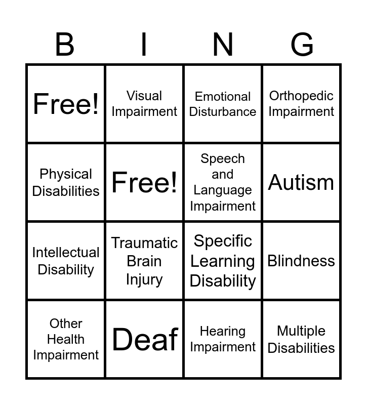 This bingo card has 16 words: Deaf, Blindness, Emotional Disturbance, Free!, Intellectual Disability, Visual Impairment, Specific Learning Disability, Hearing Impairment, Physical Disabilities, Free!, Other Health Impairment, Orthopedic Impairment, Traumatic Brain Injury, Autism, Speech and Language Impairment and Multiple Disabilities.