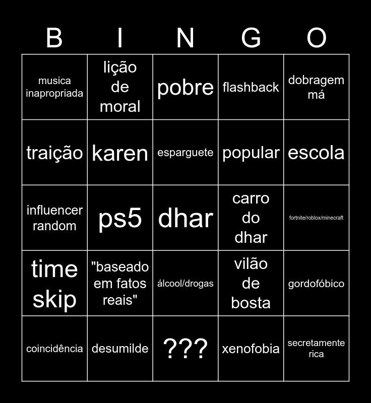 This bingo card has a free space and 39 words: sabe..., criança e um ipad, mimado, karen, coincidência, álcool/drogas, esparguete, merch aleatória, dobragem má, time skip, ps5, flashback, secretamente rica, fortnite/roblox/minecraft, carro do dhar, "baseado em fatos reais", random confronto no estacionamento, musica inapropriada, criança com maturidade alta, vilão de bosta, traição, ???, popular, escola, falar sozinho, apelidos, estúdios do dhar mann, "está demitido", youtuber random, lição de moral, bully, protestos, pobre, desumilde, xenofobia, very expensive marca, gordofóbico, influencer random and kid insuportável.