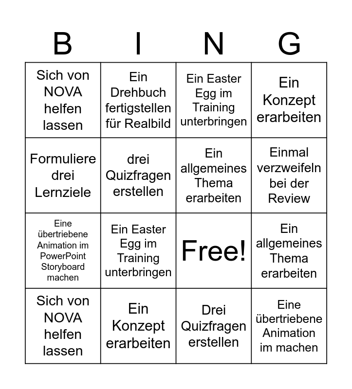 This bingo card has 22 words: Ein Konzept erarbeiten, Ein Drehbuch fertigstellen für 2D, Ein Drehbuch fertigstellen für Realbild, Ein Konzept über den Haufen schmeißen, drei Quizfragen erstellen, Ein allgemeines Thema erarbeiten, Sich von NOVA helfen lassen, Ein Easter Egg im Training unterbringen, Free!, Eine übertriebene Animation im machen, Eine übertriebene Animation im PowerPoint Storyboard machen, Ein Konzept erarbeiten, Ein Drehbuch fertigstellen für 2D, Ein Drehbuch fertigstellen für Realbild, Drei Quizfragen erstellen, Ein Konzept über den Haufen schmeißen, Ein allgemeines Thema erarbeiten, Sich von NOVA helfen lassen, Ein Easter Egg im Training unterbringen, Formuliere drei Lernziele, Einmal verzweifeln bei der Review and Eine übertriebene Animation im PowerPoint Storyboard machen.
