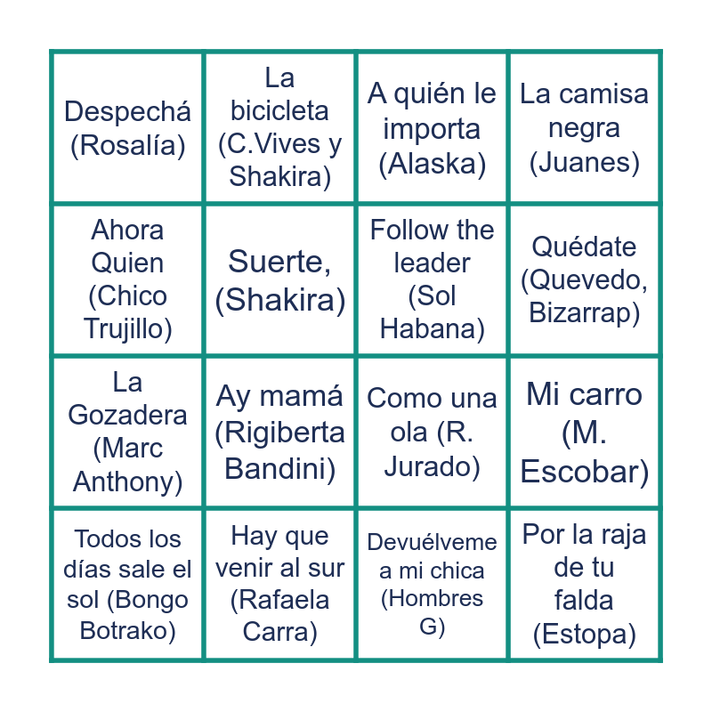 This bingo card has 60 words: Que te den (Amparanoia), Si antes te hubiera conocido (Karol G), Cuando zarpa el amor (Camela), Por la raja de tu falda (Estopa), Gasolina (Daddy Yankee), Livin´la vida loca (Ricky Martin), Follow the leader (Sol Habana), Potra Salvaje (Isabel Aaiun), La Gozadera (Marc Anthony), Sarandonga (Lolita), La camisa negra (Juanes), El tiburón (Proyecto uno), Suerte, (Shakira), You're the one that I want (J.Travolta y O. Newton), Solo se vive una vez (Azucar Moreno), Despechá (Rosalía), Todos los días sale el sol (Bongo Botrako), Ahora Quien (Chico Trujillo), MariCarmen (La pegatina), Quédate (Quevedo, Bizarrap), Hay que venir al sur (Rafaela Carra), A quién le importa (Alaska), Mi Gran Noche (Rafael), La Bomba (King Africa), Vivir mi vida (Marc Anthony), Suavemente (Elvis Crespo), Amigos para siempre (Los Manolos), Salta (Tequila), Ay mamá (Rigiberta Bandini), I will Survive (Aretha Franklin), La chica yeyé (Ole Ole), Formentera (Aitana), Volaré (Gipsy Kings), Bamboleo (Gipsy Kings), La bicicleta (C.Vives y Shakira), La mordidita (Ricky Martin), Desatame (M. Naranjo), Mi carro (M. Escobar), El muerto vivo (Peret), Como una ola (R. Jurado), Se me enamora el alma (I. Pantoja), Amante bandido (Miguel Bosé), Devuélveme a mi chica (Hombres G), Escándalo (Rafael), Mala Vida (Mano Negro), Quiero tener tu presencia (Seguridad Social), Mi Tierra (Gloria Estefan), El pantalón (O.Montes, L.Indigo etc), Sobreviviré (M. Naranjo), Nochentera (Vicco), Despacito (Luis Fonsi), Todos me miran (Gloria Trevi), Madre Tierra (Chayanne), Kesi (Camilo), Waka Waka (Shakira), Eva Maria (Formula V), Con altura (Las Ginebras), Zapatillas (El canto del Loco), Las mujeres ya no lloran (Shakira, Bizarrap) and Que dolor (Rafaella Carrá).