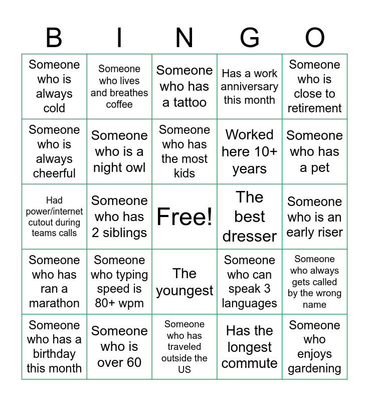This bingo card has a free space and 24 words: Someone who typing speed is 80+ wpm, Someone who is over 60, Someone who has the most kids, Someone who has a birthday this month, Someone who is close to retirement, Someone who is always cold, Someone who is always cheerful, Someone who lives and breathes coffee, The best dresser, The youngest, Worked here 10+ years, Had power/internet cutout during teams calls, Someone who can speak 3 languages, Someone who always gets called by the wrong name, Someone who is a night owl, Has the longest commute, Someone who is an early riser, Someone who has a tattoo, Someone who has a pet, Someone who has 2 siblings, Someone who enjoys gardening, Someone who has ran a marathon, Has a work anniversary this month and Someone who has traveled outside the US.