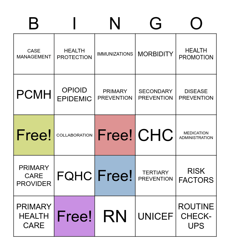 This bingo card has a free space and 24 words: FQHC, Free!, PRIMARY PREVENTION, PRIMARY HEALTH CARE, HEALTH PROMOTION, CASE MANAGEMENT, PCMH, HEALTH PROTECTION, CHC, Free!, SECONDARY PREVENTION, Free!, TERTIARY PREVENTION, RISK FACTORS, OPIOID EPIDEMIC, UNICEF, MEDICATION ADMINISTRATION, IMMUNIZATIONS, DISEASE PREVENTION, COLLABORATION, ROUTINE CHECK-UPS, PRIMARY CARE PROVIDER, MORBIDITY and RN.