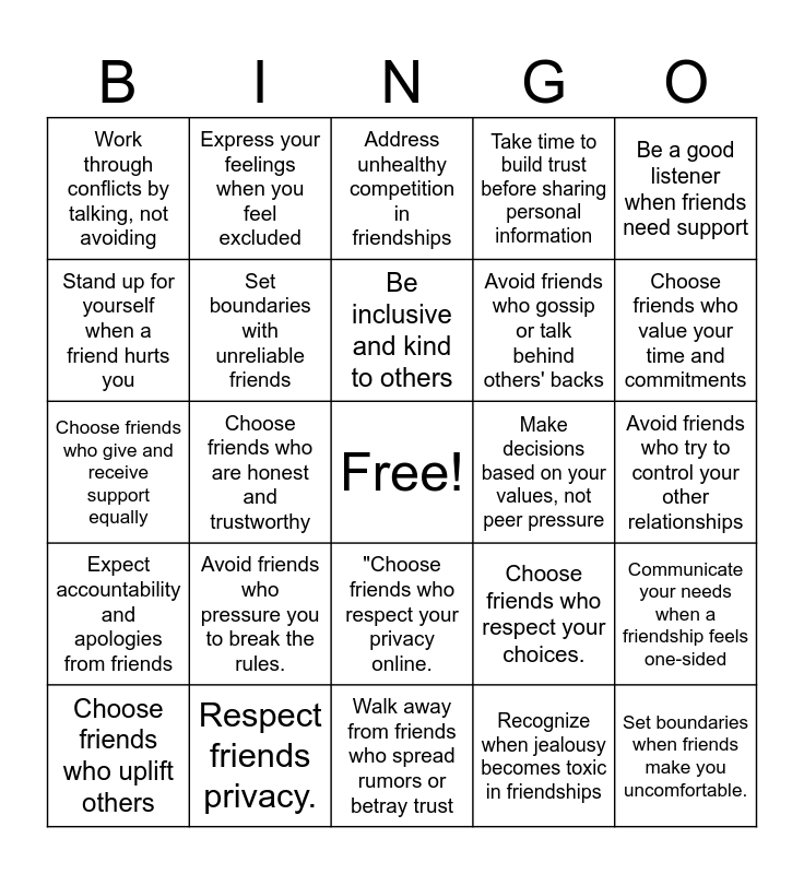 This bingo card has a free space and 24 words: Avoid friends who pressure you to break the rules., Respect friends privacy., Be inclusive and kind to others, Choose friends who uplift others, Be a good listener when friends need support, Work through conflicts by talking, not avoiding, Stand up for yourself when a friend hurts you, Express your feelings when you feel excluded, Make decisions based on your values, not peer pressure, "Choose friends who respect your privacy online., Avoid friends who gossip or talk behind others' backs, Choose friends who give and receive support equally, Choose friends who respect your choices., Communicate your needs when a friendship feels one-sided, Set boundaries with unreliable friends, Recognize when jealousy becomes toxic in friendships, Avoid friends who try to control your other relationships, Address unhealthy competition in friendships, Choose friends who value your time and commitments, Choose friends who are honest and trustworthy, Set boundaries when friends make you uncomfortable., Expect accountability and apologies from friends, Take time to build trust before sharing personal information and Walk away from friends who spread rumors or betray trust.