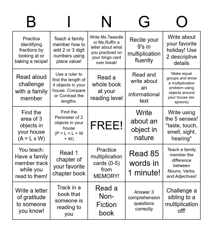 This bingo card has a free space and 24 words: Read 1 chapter of your favorite chapter book, Track in a book that someone is reading to you, Read a whole book at your reading level, Write a letter of gratitude to someone you know!, Write about your favorite holiday! Use 2 descriptive details, Practice identifying fractions by looking at or baking a recipe!, Read aloud challenge with a family member, Teach a family member how to add 2 or 3 digit numbers using place value!, Write about an object in nature, Practice multiplication cards (0-5) from MEMORY!, Read and write about an informational text, Find the area of 3 objects in your house (A = L x W), Read 85 words in 1 minute!, Teach a family member the difference between Nouns, Verbs, and Adjectives!, Use a ruler to find the length of 4 objects in your house. Compare or Contrast the lengths., Answer 3 comprehension questions correctly, Write using the 5 senses! *taste, touch, smell, sight, hearing*, Write Ms.Tweedle or Ms.Ruffin a letter about what you practiced on your bingo card over break!, Make equal groups and show a multiplication problem using objects around your house (ex. spoons), Find the Perimeter of 2 objects in your house (P = L + L + W + W), Challenge a sibling to a multiplication off!, You teach: Have a family member track while you read to them!, Recite your 9's in multiplication fluently and Read a Non-Fiction book.