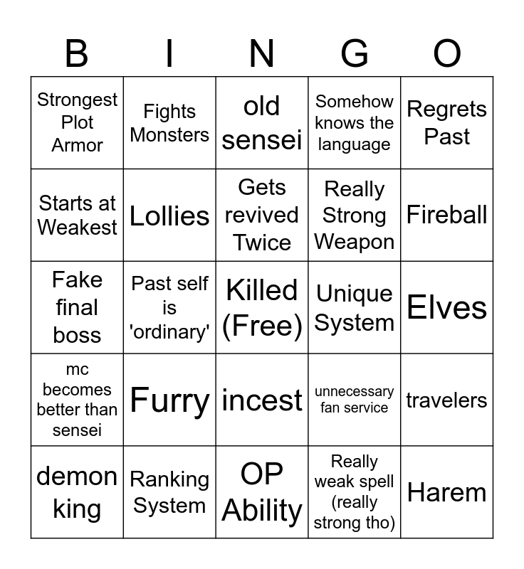This bingo card has a free space and 50 words: Truck-Kun, Harem, Fanservice, OP Ability, Furry, Guild, Fights Monsters, Becomes strongest, Starts at Weakest, Self-Insert MC, Lollies, Somehow knows the language, travelers, unnecessary fan service, Magic school, Dungeons, Gets revived Twice, Unique System, Spells/Magic, Regrets Past, Past self is 'ordinary', Really weak spell (really strong tho), Strongest Plot Armor, Really Strong Weapon, Learns very few spells, One overpowered spell, Fireball, nonchalant character, old sensei, incest, random SA scene, obsessive girl over mc, Weak MC, Shopkeeper, Ranking System, S-Rank, 'I was reincarnated-', long title, Self aware, Elves, Girl Dungeon Keeper, Random Popular Guy, Heroic side character, Airheads, demon king, Fake final boss, family relationship with random character, random failures to extend the story, mc becomes better than sensei and God blesses mc.