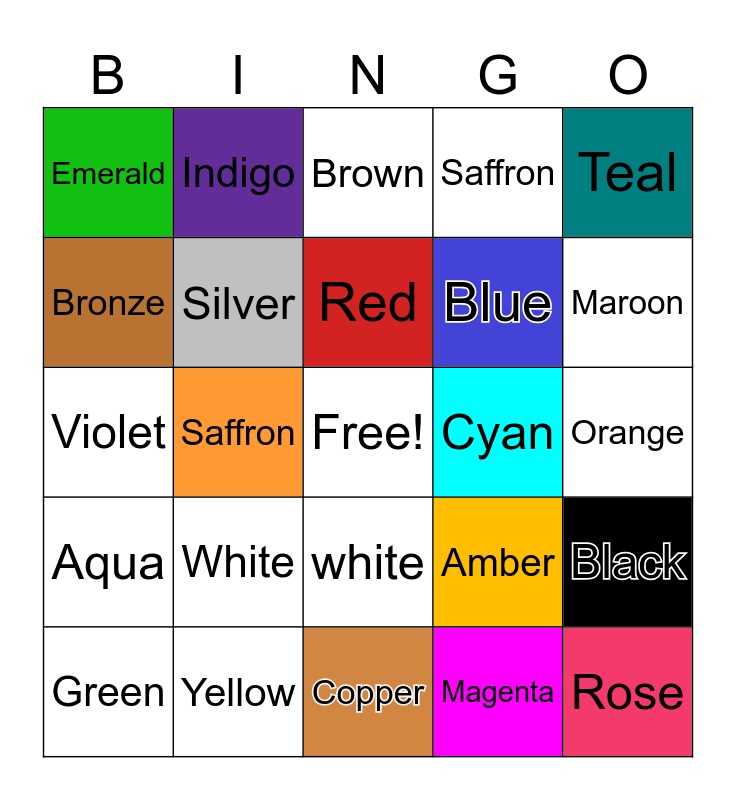 This bingo card has a free space and 52 words: Maroon, Rose, Green, Copper, White, Orange, Indigo, Gold, Bronze, Canary, Silver, Grey, Black, Amber, Brown, Pink, Red, Cyan, Scarlet, Teal, Saffron, Magenta, Emerald, Blue, Grey, orange, Salmon, Silver, Maroon, Red, Indigo, Saffron, Amber, Magenta, Purple, Brown, Yellow, Paprika, Pink, Cyan, Olive, Orange, Aqua, Marron, white, Copper, Blue, Violet, Rose, White, Green and Scarlet.