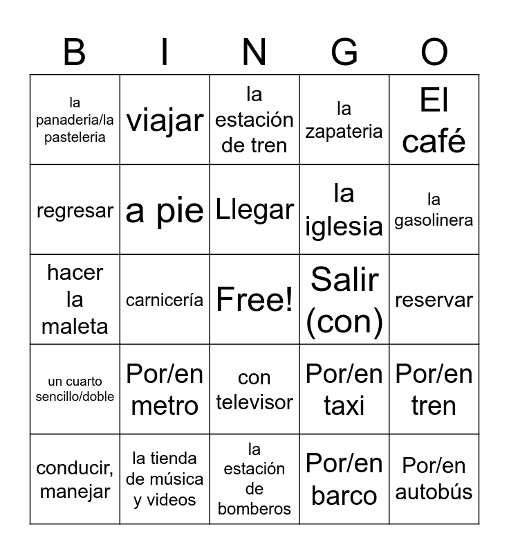 This bingo card has a free space and 53 words: ¡Buen viaje!, Por/en autobús, Por/en carro/auto/coche, Por/en barco, Por/en metro, Por/en moto(cicleta), viajar, venir, regresar, alquilar, a pie, Por/en avión, Por/en tren, Por/en taxi, Por/en bicicleta, conducir, manejar, Llegar, Salir (con), El banco, El café, carnicería, la farmacia, la iglesia, la panaderia/la pasteleria, la frutería, la tienda de música y videos, la estación de policía, la estación de metro, el hospital, la gasolinera, el aeropuerto, El edificio, El centro comercial, la plaza, la joyeria, el supermercado (el súper), la zapateria, la estación de bomberos, la estación de tren, la oficina de correos, el rascacielos, Quedarse, reservar, un cuarto/habitación, una cama, con televisor, con aire acondicionado, la llave, hacer la maleta, un cuarto sencillo/doble, un baño privado, con vista and con teléfono.