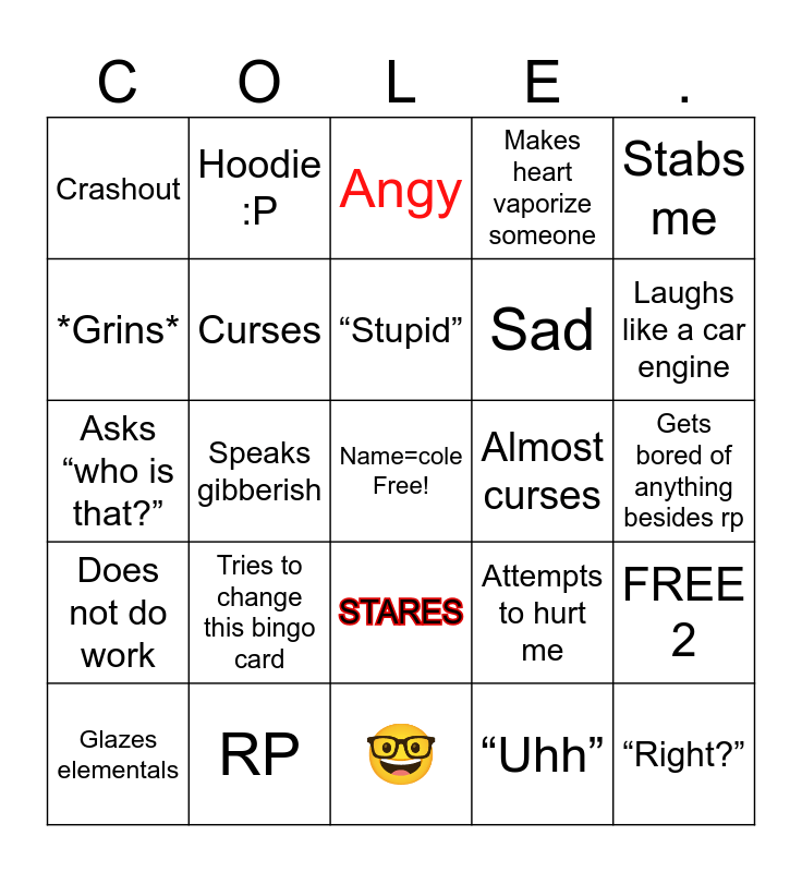 This bingo card has a free space and 29 words: Glazes elementals, Glazes heart, Speaks gibberish, Interrupts, Crashout, Angy, Curses, Tries to change this bingo card, Almost curses, RP, Gets bored of anything besides rp, “Right?”, 🤓, “Uhh”, Laughs like a car engine, Mad at carlos, STARES, Does not do work, Stabs me, Asks “who is that?”, Attempts to hurt me, Ignores, Sad, *Grins*, Makes heart vaporize someone, Hoodie :P, FREE 2, “Stupid” and “I think ____”.