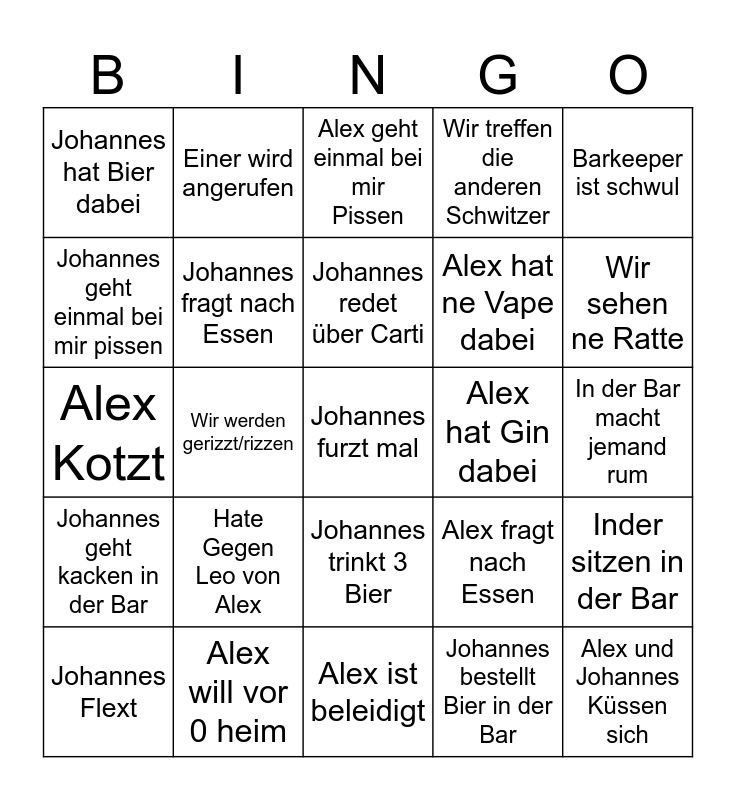 This bingo card has a free space and 24 words: Hate Gegen Leo von Alex, Alex will vor 0 heim, Johannes redet über Carti, Johannes Flext, Barkeeper ist schwul, Johannes hat Bier dabei, Johannes geht einmal bei mir pissen, Einer wird angerufen, Alex hat Gin dabei, Johannes trinkt 3 Bier, Alex hat ne Vape dabei, Alex Kotzt, Alex fragt nach Essen, Inder sitzen in der Bar, Johannes fragt nach Essen, Johannes bestellt Bier in der Bar, In der Bar macht jemand rum, Alex geht einmal bei mir Pissen, Wir sehen ne Ratte, Wir werden gerizzt/rizzen, Alex und Johannes Küssen sich, Johannes geht kacken in der Bar, Wir treffen die anderen Schwitzer and Alex ist beleidigt.
