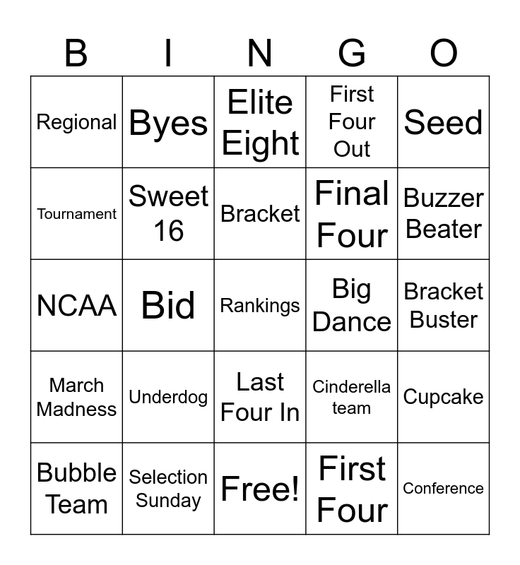 This bingo card has 26 words: March Madness, Selection Sunday, Bracket, First Four, Seed, Regional, Sweet 16, Elite Eight, Final Four, Conference, Tournament, Bid, Free!, Cinderella team, Bracket Buster, "SAG", Byes, Last Four In, First Four Out, Cupcake, NCAA, Underdog, Rankings, Big Dance, Buzzer Beater and Bubble Team.