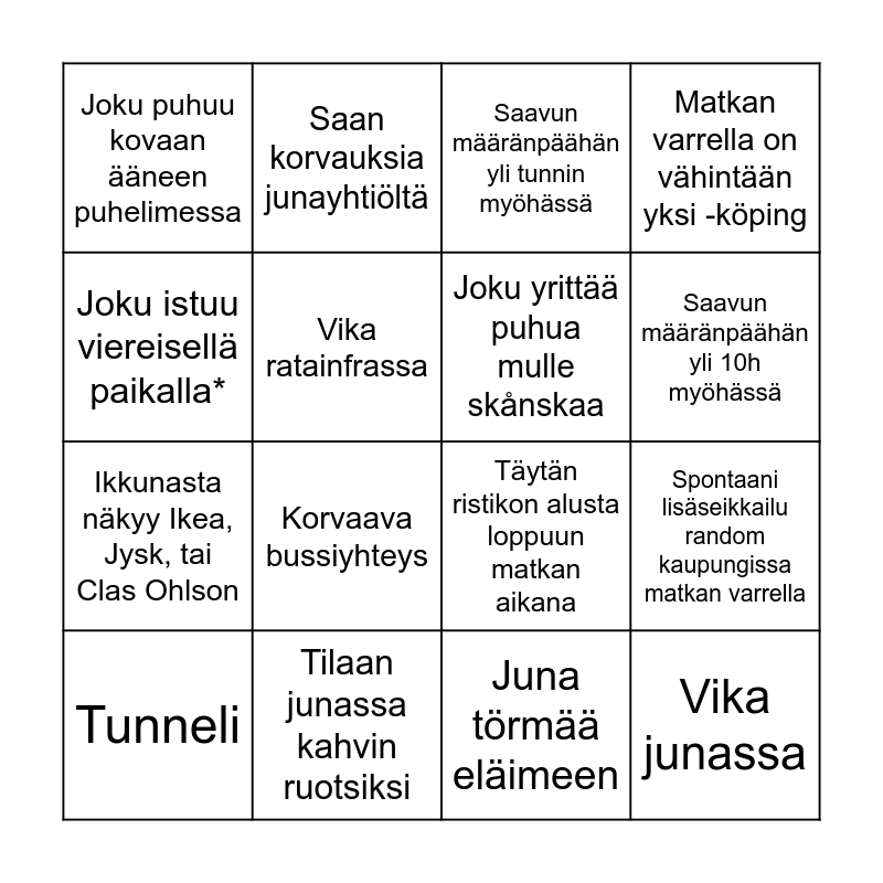 This bingo card has 16 words: Tilaan junassa kahvin ruotsiksi, Spontaani lisäseikkailu random kaupungissa matkan varrella, Saavun määränpäähän yli tunnin myöhässä, Joku puhuu kovaan ääneen puhelimessa, Ikkunasta näkyy Ikea, Jysk, tai Clas Ohlson, Saan korvauksia junayhtiöltä, Täytän ristikon alusta loppuun matkan aikana, Juna törmää eläimeen, Joku istuu viereisellä paikalla*, Vika ratainfrassa, Tunneli, Matkan varrella on vähintään yksi -köping, Korvaava bussiyhteys, Saavun määränpäähän yli 10h myöhässä, Joku yrittää puhua mulle skånskaa and Vika junassa.