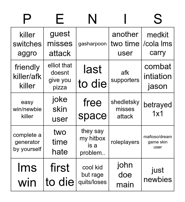 This bingo card has a free space and 24 words: two time hate, first to die, last to die, lms win, medkit /cola lms carry, killer switches aggro, friendly killer/afk killer, guest misses attack, shedletsky misses attack, they say my hitbox is a problem.., afk supporters, easy win/newbie killer, roleplayers, mafioso/dream game skin user, elliot that doesnt give you pizza, john doe main, betrayed 1x1, gasharpoon, combat intiation jason, joke skin user, just newbies, complete a generator by yourself, another two time user and cool kid but rage quits/loses.