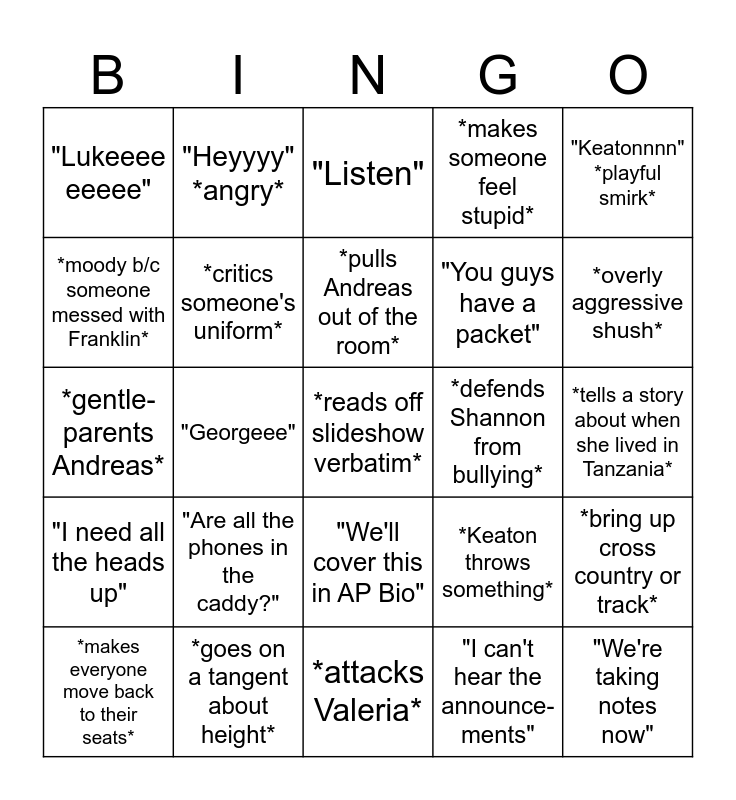 This bingo card has 25 words: "Are all the phones in the caddy?", *attacks Valeria*, *pulls Andreas out of the room*, *makes everyone move back to their seats*, "Keatonnnn" *playful smirk*, "Lukeeee eeeee", *moody b/c someone messed with Franklin*, "Heyyyy" *angry*, *defends Shannon from bullying*, "We'll cover this in AP Bio", "You guys have a packet", *gentle-parents Andreas*, *Keaton throws something*, *bring up cross country or track*, *critics someone's uniform*, "We're taking notes now", *tells a story about when she lived in Tanzania*, "Listen", *overly aggressive shush*, "Georgeee", *reads off slideshow verbatim*, *goes on a tangent about height*, "I need all the heads up", *makes someone feel stupid* and "I can't hear the announce-ments".