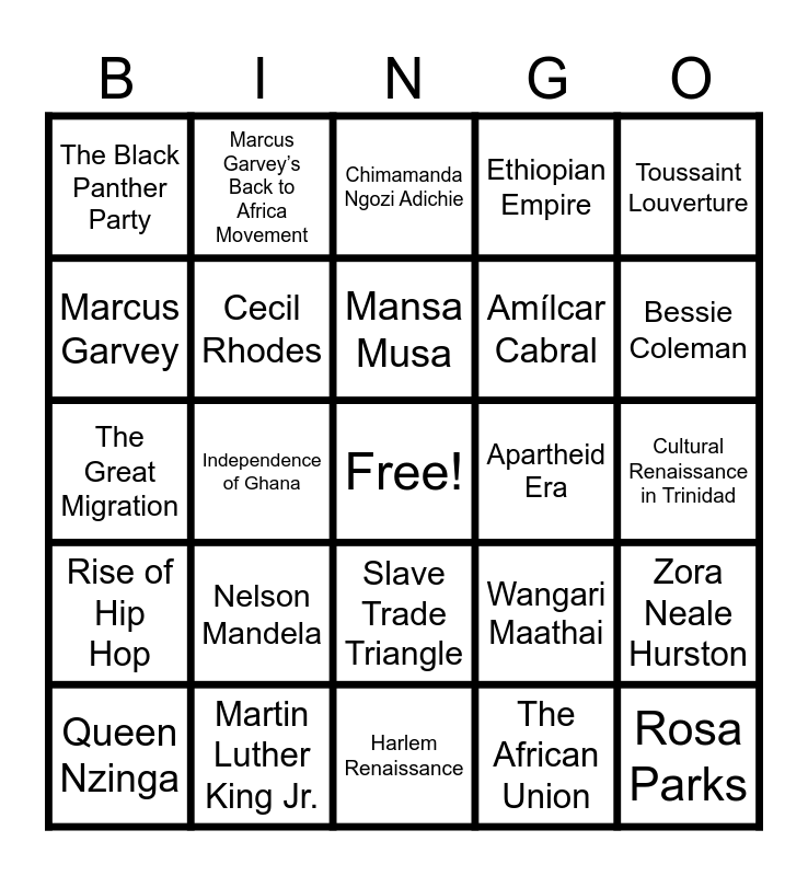 This bingo card has a free space and 25 words: Nelson Mandela, Harlem Renaissance, Mansa Musa, Queen Nzinga, Toussaint Louverture, The Black Panther Party, Marcus Garvey, Marcus Garvey’s Back to Africa Movement, Apartheid Era, Slave Trade Triangle, Amílcar Cabral, The Great Migration, Wangari Maathai, Zora Neale Hurston, Cecil Rhodes, Sankofa, Cultural Renaissance in Trinidad, Chimamanda Ngozi Adichie, Bessie Coleman, Independence of Ghana, Rosa Parks, Martin Luther King Jr., Rise of Hip Hop, Ethiopian Empire and The African Union.