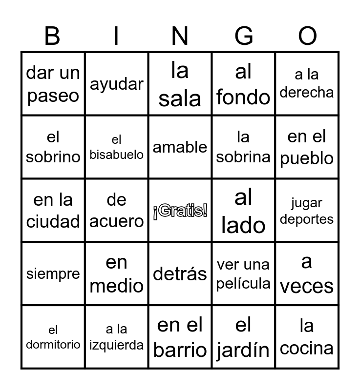 This bingo card has a free space and 44 words: no puedo, la cocina, el comedor, el dormitorio, el garaje, el jardín, la sala, la terraza, a la derecha, a la izquierda, al fondo, al lado, detrás, en medio, en una avenida, en el barrio, en el campo, en la ciudad, en una calle tranquila, en el pueblo, ayudar, cenar, comer juntos, dar un paseo, hacer ejercicio, jugar deportes, ir al cine, salir con amigos, ver una película, siempre, todos los días, a veces, nunca, yo prefiero, de acuero, impaciente, grande, joven, amable, el sobrino, la sobrina, mascota, el bisabuelo and la bisabuela.