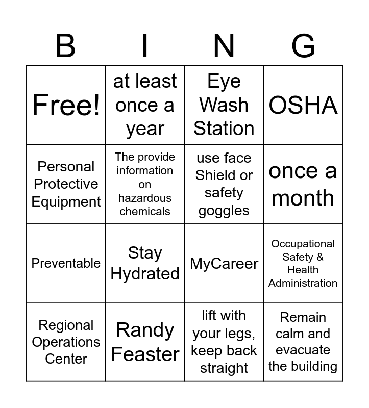 This bingo card has 16 words: Regional Operations Center, Randy Feaster, Eye Wash Station, OSHA, Personal Protective Equipment, at least once a year, MyCareer, Occupational Safety & Health Administration, Free!, The provide information on hazardous chemicals, lift with your legs, keep back straight, once a month, Preventable, Stay Hydrated, use face Shield or safety goggles and Remain calm and evacuate the building.