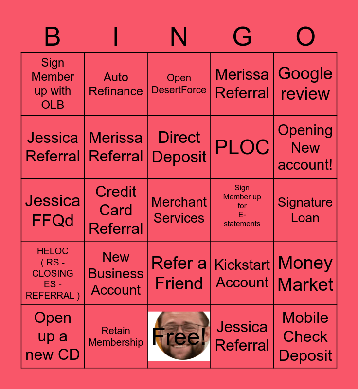 This bingo card has 1 images and 25 words: HELOC ( RS - CLOSING ES - REFERRAL ), Retain Membership, Merchant Services, Jessica Referral, Google review, Sign Member up with OLB, Auto Refinance, Open DesertForce, Sign Member up for E-statements, Money Market, Jessica Referral, Merissa Referral, Free!, Kickstart Account, Opening New account!, Open up a new CD, Credit Card Referral, Direct Deposit, PLOC, Signature Loan, Jessica FFQd, New Business Account, Refer a Friend, Merissa Referral and Mobile Check Deposit.